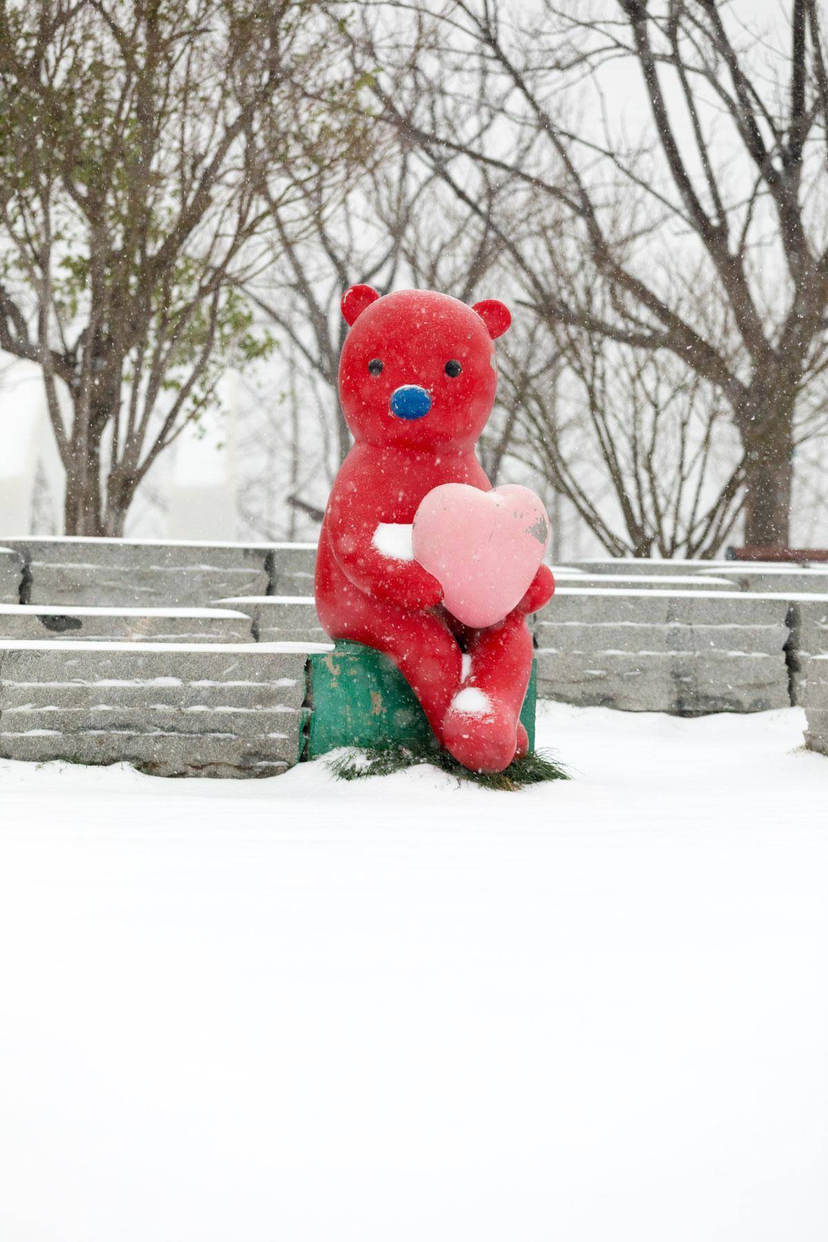 雪地上,全部谈浅深不一的车辙印鬈曲伸展,仿佛是冬日留住的特有钤记。憨态可掬的卡通仔雕镂静静伫立在雪中,满身落满白雪,宛如从童话绘本中走出来的扮装,呆萌又可人。